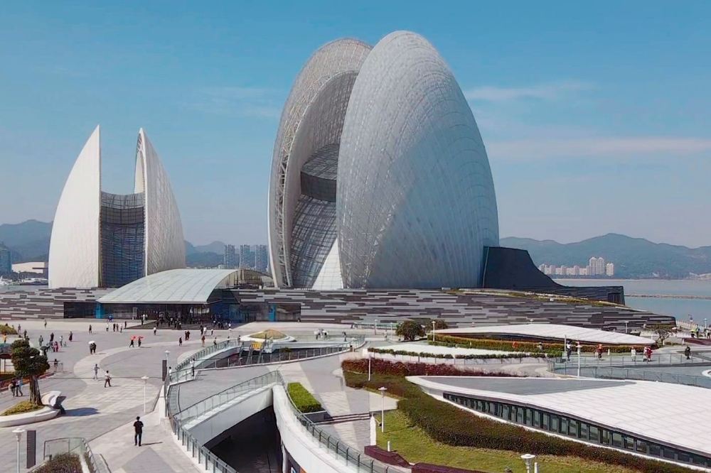 中国建在海岛上的大剧院,纯白贝壳造型象征“珠生于贝,贝生于海”。白天在银湾广场草坪仰拍,贝壳与蓝天相映;夜晚19:30亮灯后,蓝光倒映海面,星巴克二楼是拍照机位,穿搭白色长裙秒变南法度假风。