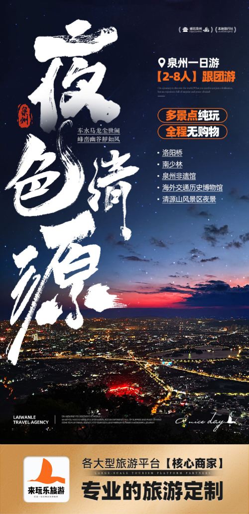 洛阳桥+南少林+非遗馆+海外博物馆+清源山夜看泉州古城一日游【[精品线路策划]清源山海拔较高,夜晚站在山顶可以俯瞰整个泉州市区的夜景,灯火辉煌的城市景观尽收眼底。】