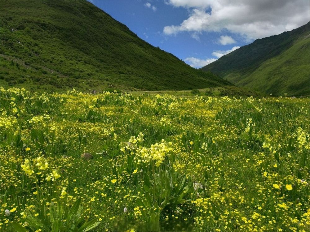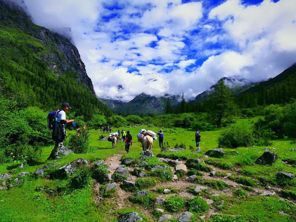 - 骑马穿越海子沟,朝山坪看野花铺满山坡,眺望四峰同框。