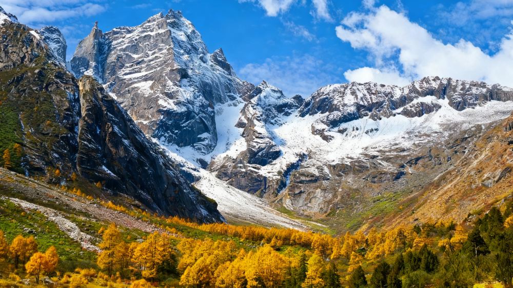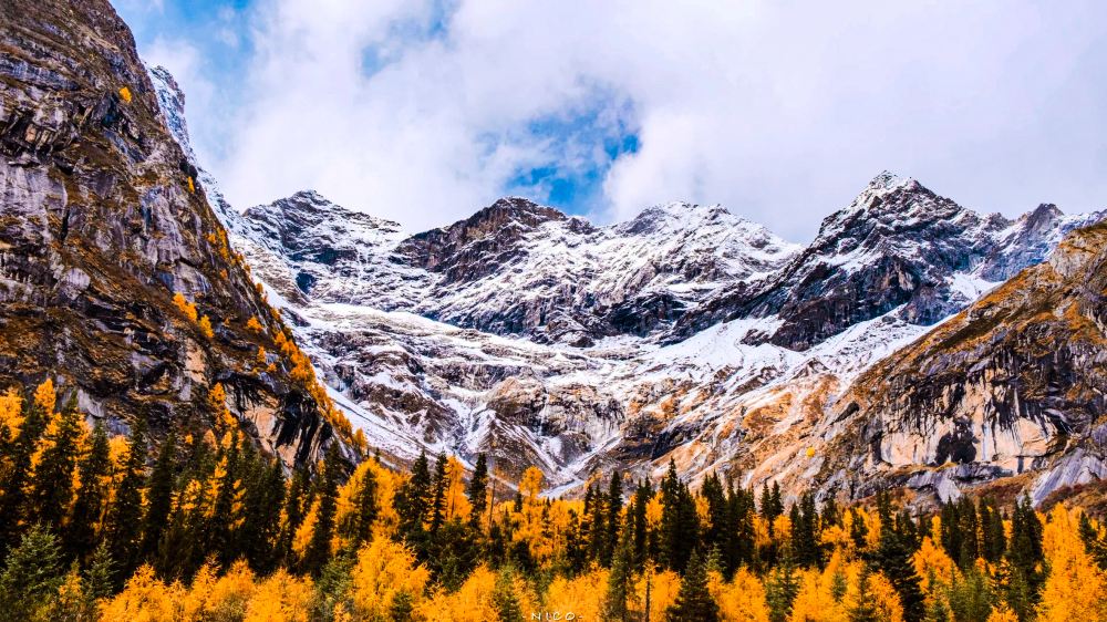 ▲ 雪山巍峨,部分山体覆盖着白雪,山下的彩林呈现出金黄的色彩