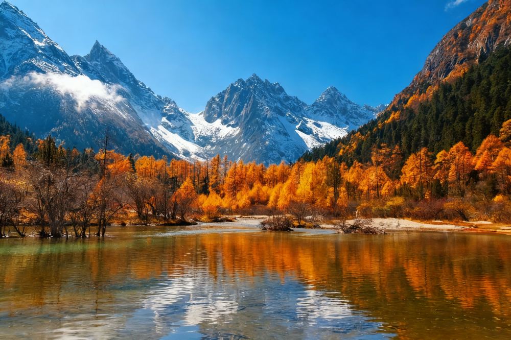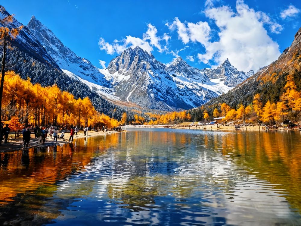 ▲ 湖泊清澈,倒映着周围的雪山和金黄的彩林,湖水的倒影让景色更加迷人,是观赏和摄影的好地点