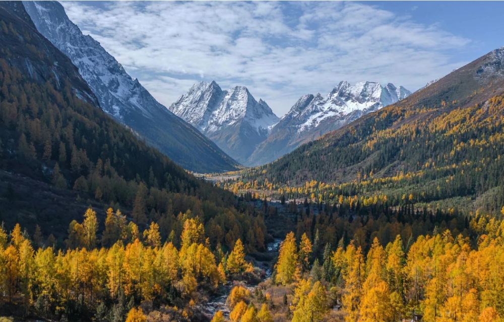 ▲ 峡谷两侧的山林呈现出大面积的金黄,中间是河流,远处是连绵的雪山,天空中云层错落,将四姑娘山秋季的壮丽与秀美尽收眼底