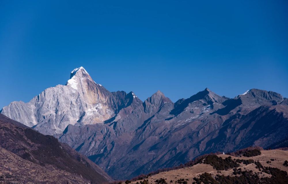 ▲ 山峰造型挺拔险峻,岩石纹理清晰,顶部覆盖着皑皑白雪,在蓝天的映衬下极具视觉冲击力,是登山爱好者和摄影爱好者的胜地
