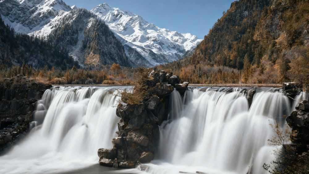 ▲ 雪山、彩林和瀑布,秋季的彩林呈现出金黄的色彩,与雪山、瀑布共同构成了一幅灵动的山水画卷