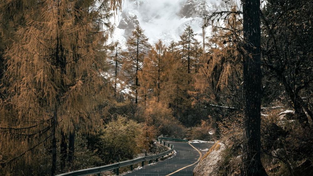 ▲ 道路蜿蜒,两旁是秋季金黄的树木,远处的雪山被云雾环绕,营造出一种静谧而深邃的氛围,体现了四姑娘山山林间的清幽之美
