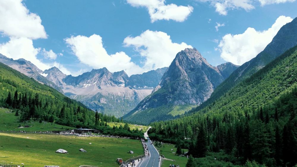 ▲ 开阔的草甸、茂密的森林,远处是巍峨的雪山,一条公路穿过景区,景色清新宜人