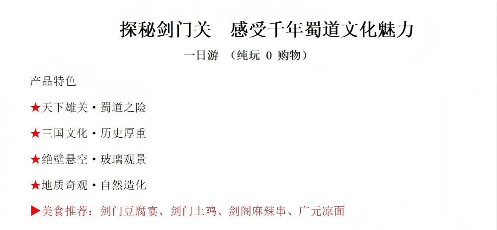 接团后统一乘车前往国家AAAAA级景区【剑门关】,从剑门关北门游客中心进入,乘坐1号索道(自费50元)可达鸟道、猿猱道(自费68元)或2号索道(自费50元)三条线路任选其一,去看亚洲第一,世界第二的悬空玻璃观景台(鞋套自费10元),去体验剑门关的奇险,沿途还可欣赏美丽风景。随后经大小穿洞,前往险峻的天梯峡栈道,剑门栈道依山傍势,凌空架木。长长的栈道在青翠的山间盘旋延伸,就像一条白色的长龙翻滚游戏在峭壁悬崖之间。绵延婉转的盘山栈道,在险峻陡峭的大山石壁上,刻出一道妩媚的曲线。走在那条逶迤蜿蜒的复建古栈道上,顿时会产生时空倒错的感觉,也令人更加深切感悟到“剑门蜀道”独特的历史文化,随后登上剑门关标志性建筑 — 关楼,远眺剑门雄峰,体验“一夫当关,万夫莫开”的剑门天险,观赏剑门关上一奇观 — 姜维神像,沿途可欣赏三国浮雕图,回忆刘皇叔的创业史,诸葛亮的征战史。(游览时间约4小时)游览结束后乘车返回剑阁县城,结束愉快旅程!