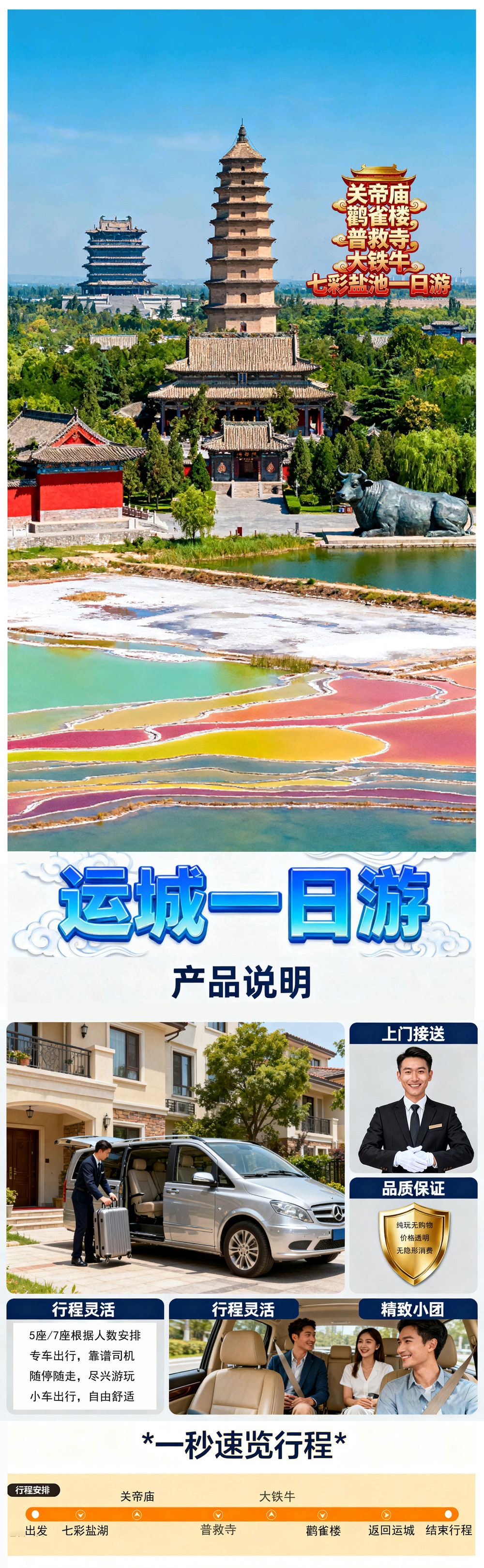【拼小团】关帝庙+盐湖+普救寺+鹳雀楼+蒲津渡大铁牛一日游【盐湖区各大酒店、运城北站、运城火车站免费上门接送服务!】