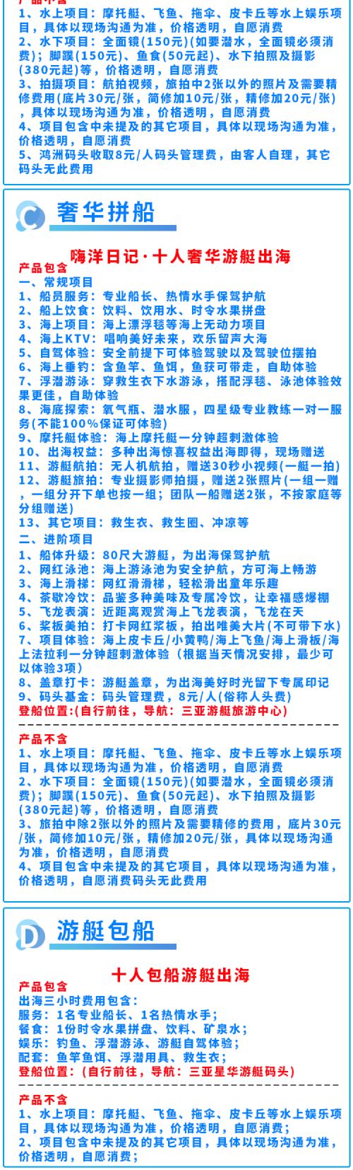 游艇每天三班: 上午班(9:00-12:00)、中午班(12:00-15:00)、下午班(15:00-18:00)(注意:婴儿也算客载人数)