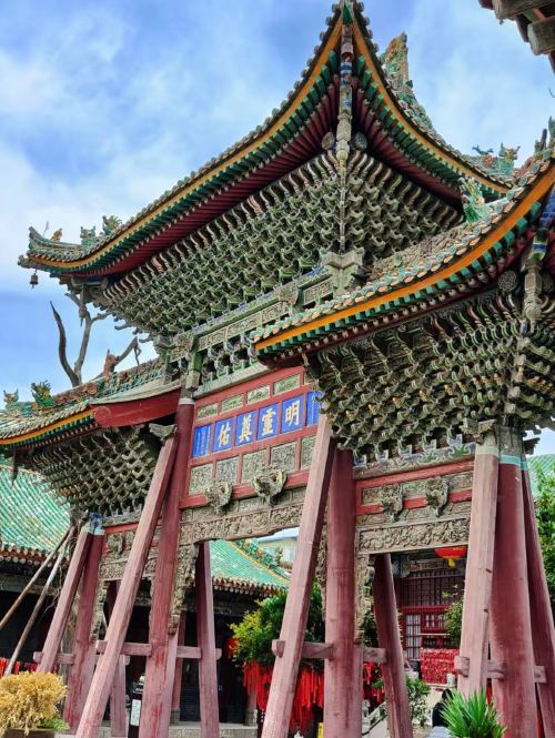 ▲ 三原城隍庙位于陕西省咸阳市三原县东大街,始建于明洪武八年(1375年),是全国现存规模大、保存完整的明清城隍庙建筑群,也是全国重点文物保护单位。庙宇采用宫廷式布局,以中轴线对称分布五重院落,涵盖照壁、木石牌坊、戏楼、钟鼓楼、大殿及寝殿等40余座单体建筑。其建筑融合砖雕、木雕与琉璃工艺,尤以照壁“鲤鱼跃龙门”浮雕、铁旗杆和八卦悬顶无梁门为特色,被誉为“穷造形之巧,毕土木之功”。庙内供奉唐代名将李靖,藏有岳飞手书《出师表》石刻等近三千件文物。每年农历八月庙会期间,戏楼仍有传统戏曲演出,延续数百年民俗