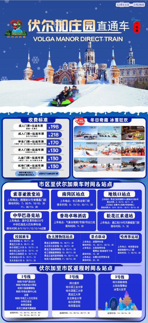 2.雪姑娘童话城堡:(1)游览参观:小巴黎建筑艺术馆、玛特廖什卡宫、弗拉基米尔堡等城堡群(2)无动力游乐场:体验套娃大滑梯、旋转滑梯、彼浪滑梯;套娃转转、套娃秋千等多项无动力游乐项目(不限次)