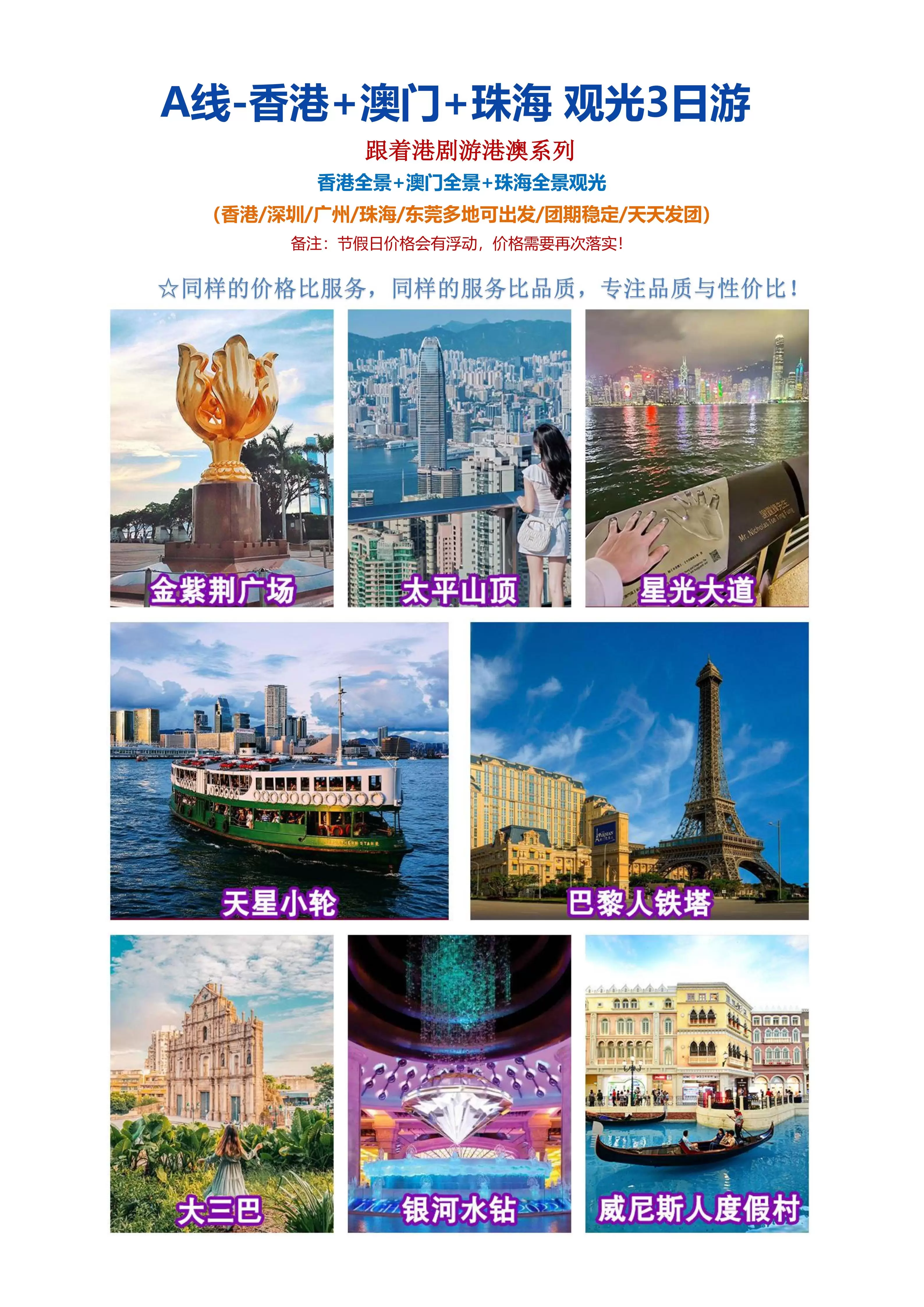 香港+澳门+珠海全景观光3日游丨送上网卡+转换插头【车观港珠澳大桥丨黄大仙庙+大三巴+圆明新园丨深圳出发】