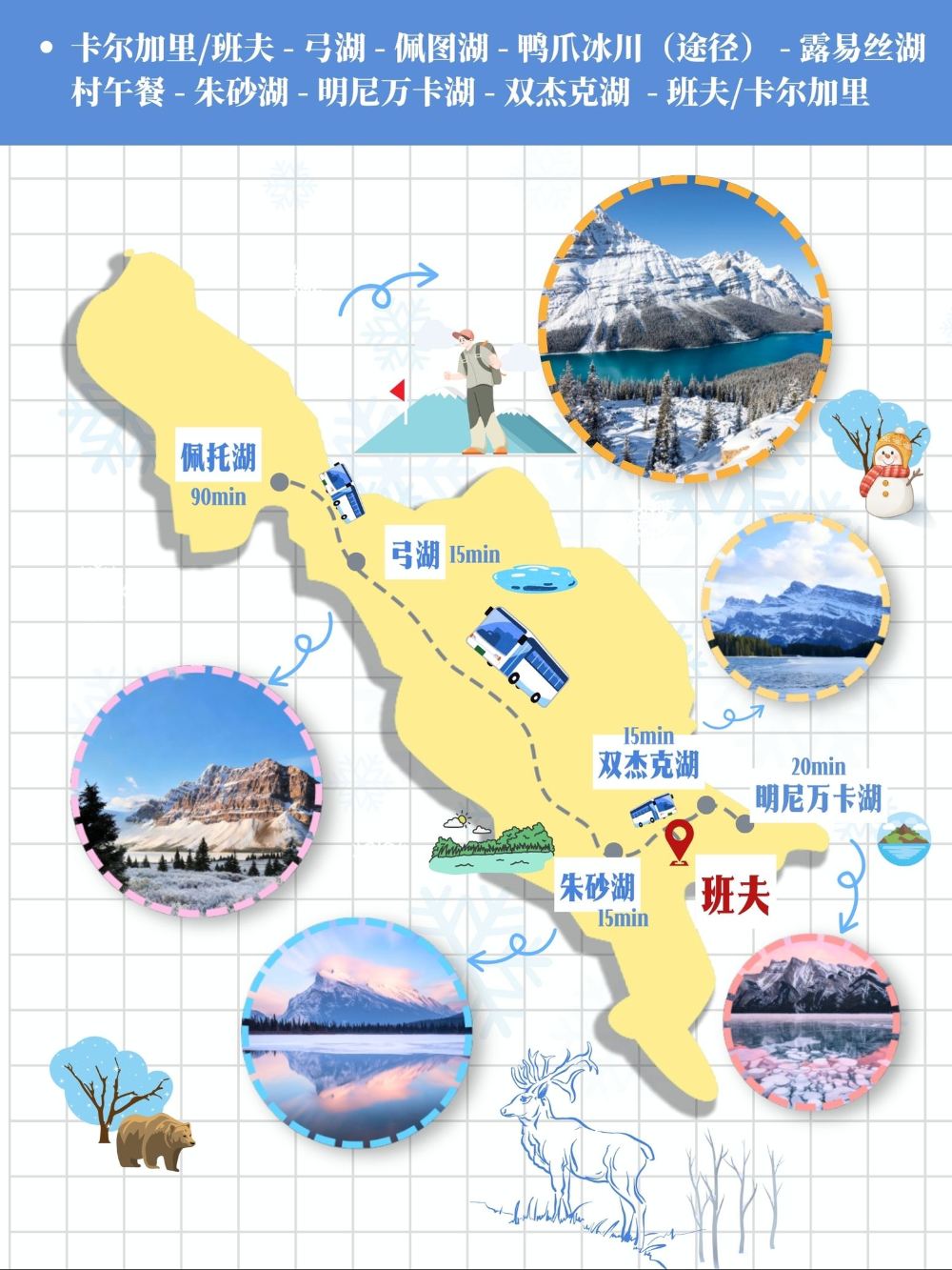 加拿大班夫国家公园一日游<轻徒步·佩图湖+弓湖/明尼万卡湖>【季节限定· 佩图湖雪地徒步,明尼万卡湖观“气泡湖”自然奇观,尽览落基山脉的精华景点】