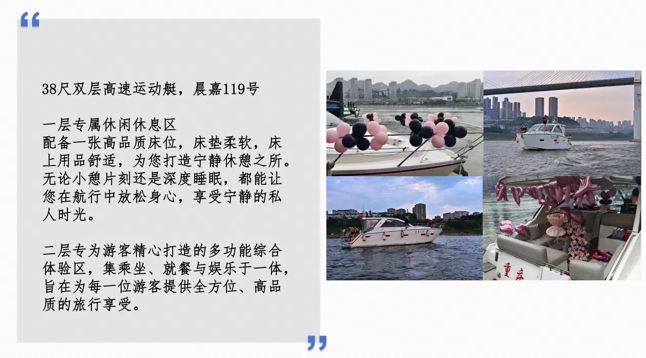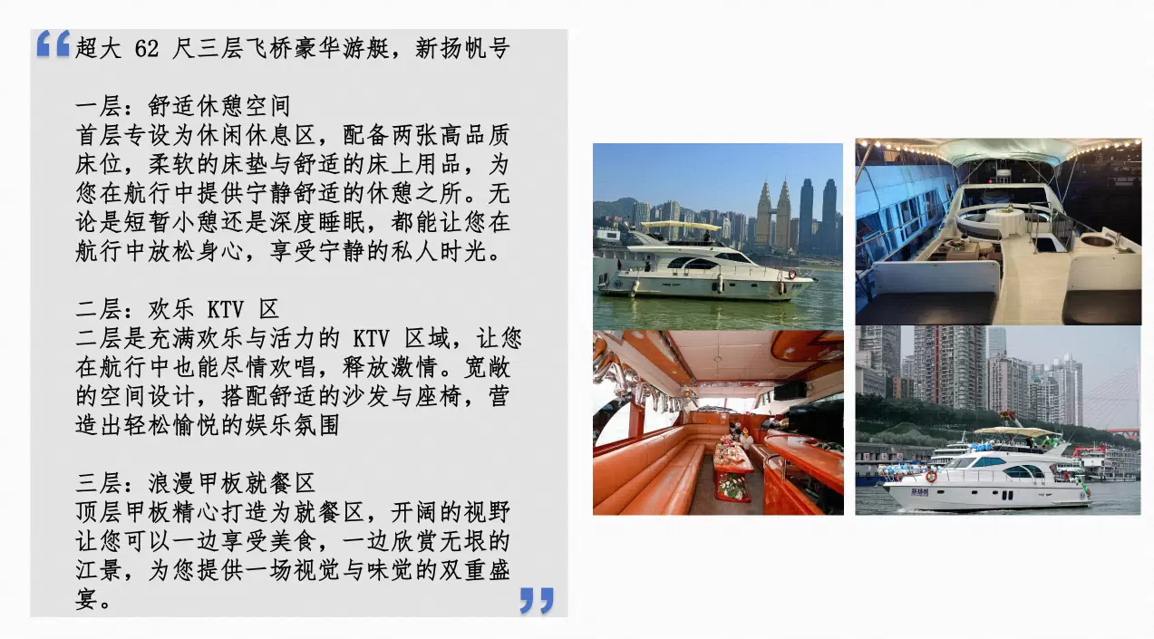 重庆雾都悠游游艇俱乐部两江游游艇包船【可选日游夜游/三层飞桥豪华游艇*商务接待】