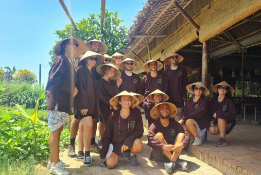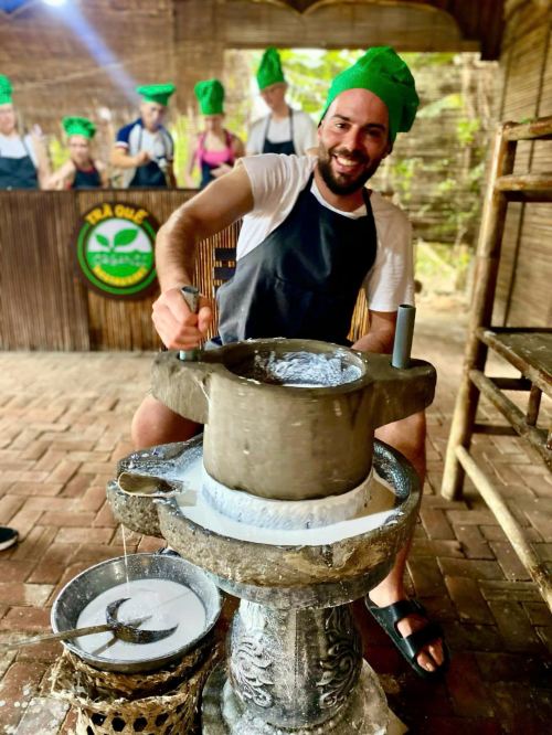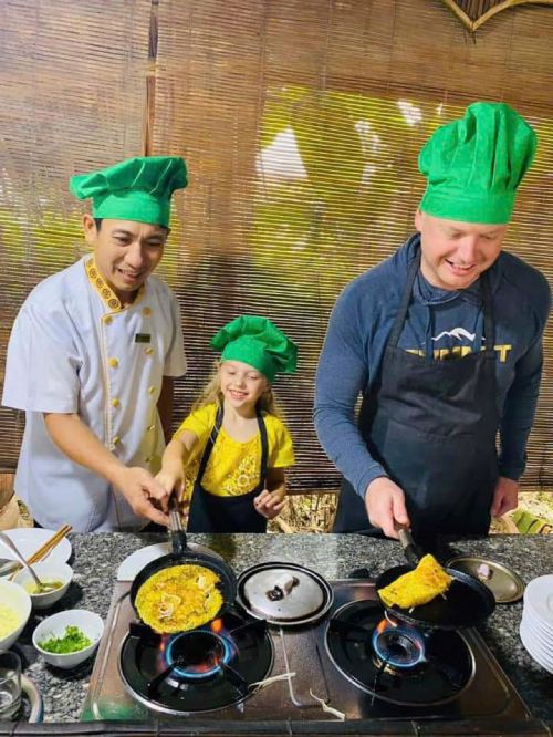 ▲ 参加一堂趣味横生的烹饪课程,在质朴的竹屋中学习制作越南特色美食,如越南煎饼(Bánh Xèo)和新鲜春卷。