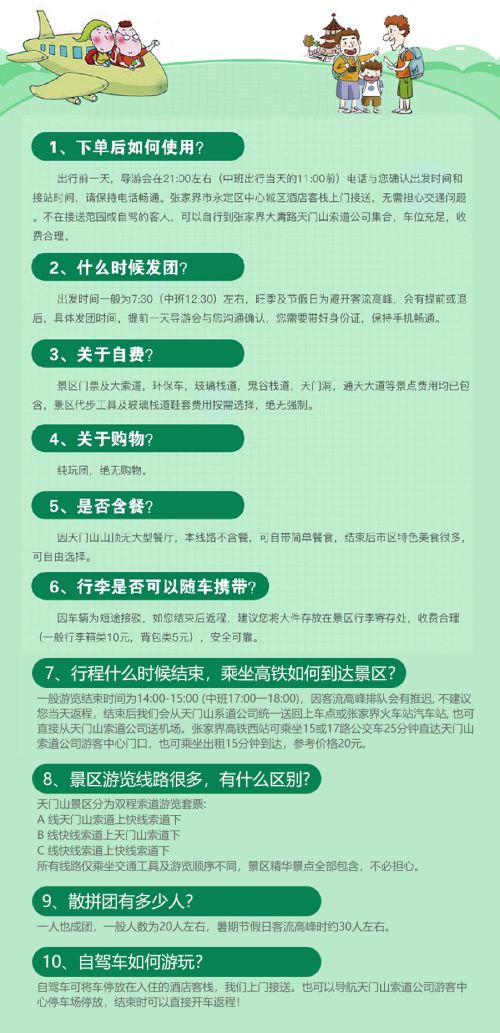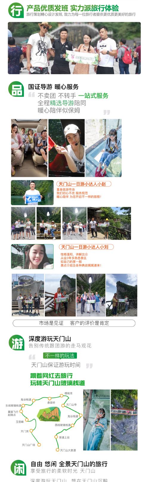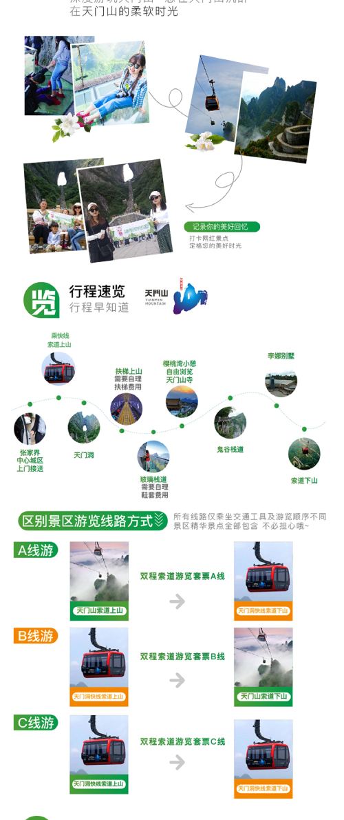 A线运营方式调整为:自天门山索道下站检票上索道——索道中站下索道——换乘环保车上行至天门洞游览——自天门洞后乘7级穿山自动扶梯上山顶——游览山顶各景点——乘7级穿山自动扶梯下至天门洞——乘天门洞快线索道下山至山门出景区。