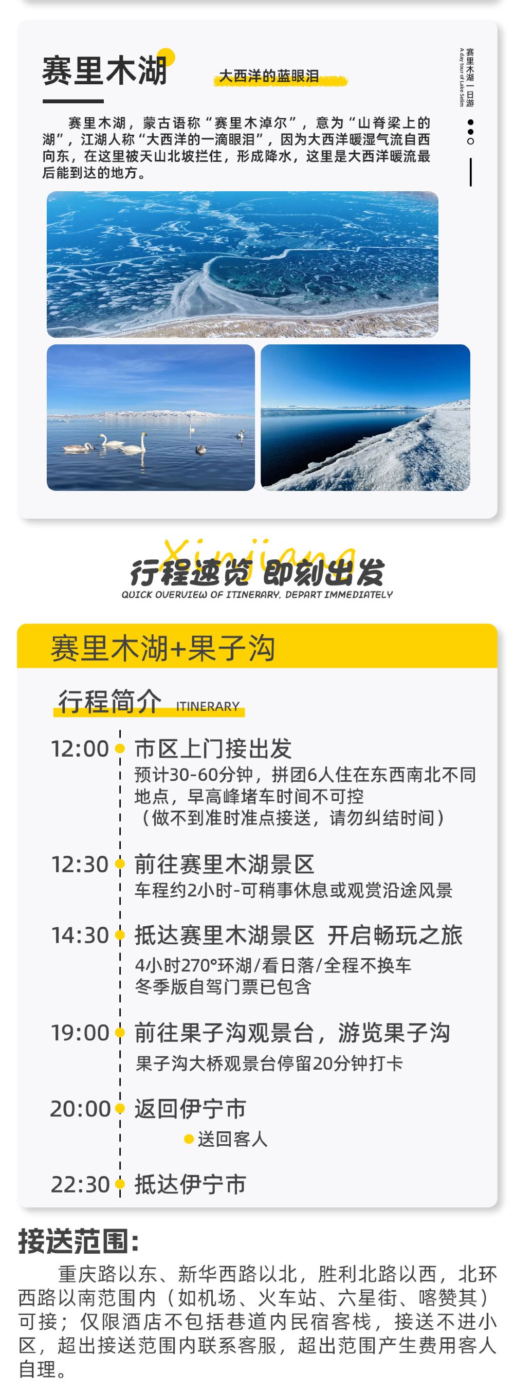 伊犁赛里木湖晚出发【落日追光】1日游小团【[核心优势]本社自发∣2-6人纯玩小团∣七座商务旅游车∣4小时深度畅游∣自驾环湖不换车】