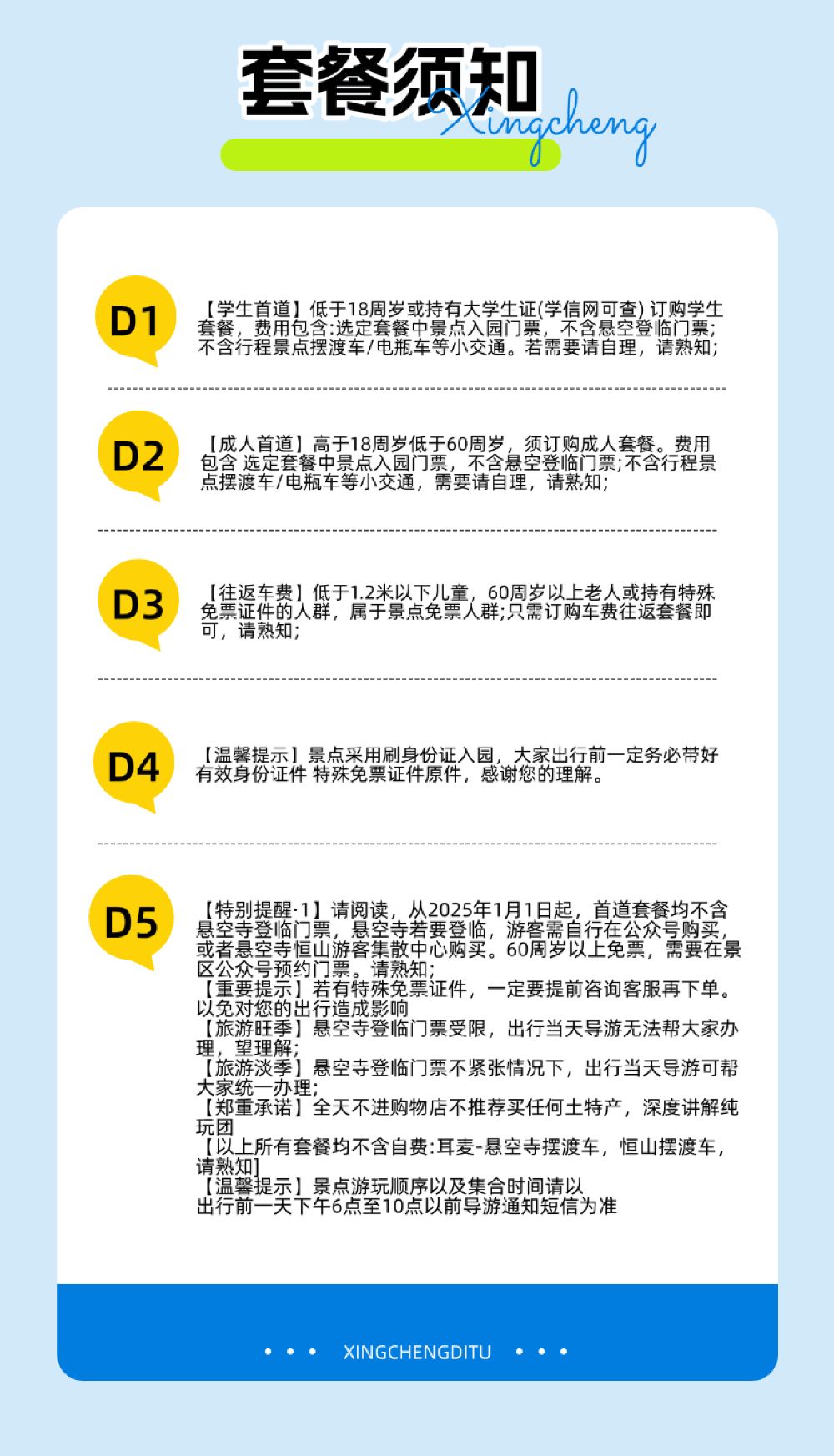 若当天无法登临,含登临票套餐可退成人悬空寺登临门票费100元,学生50元。