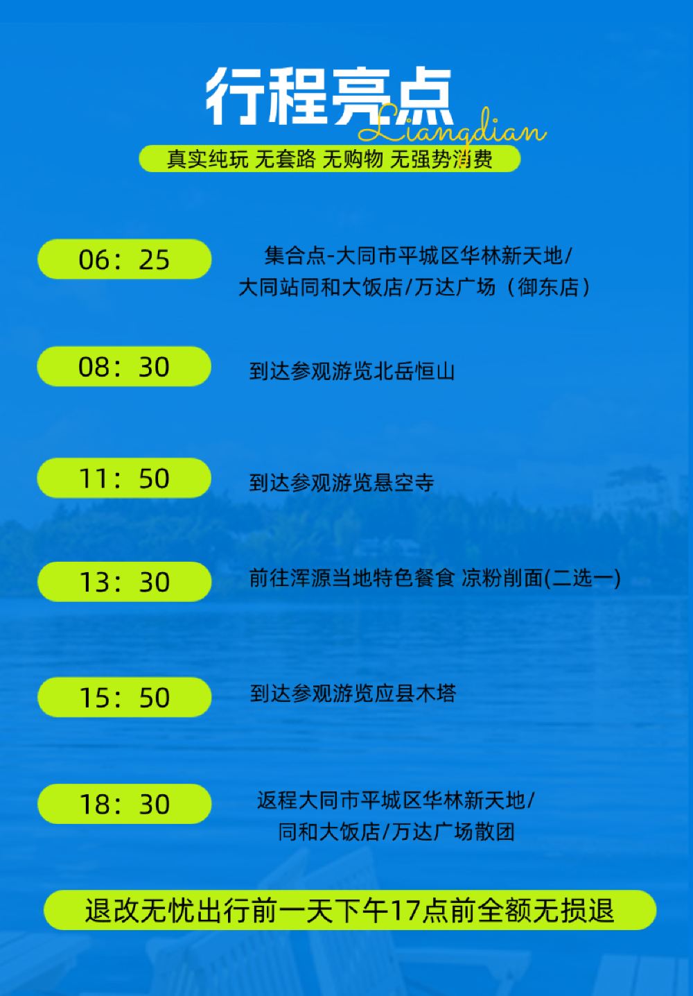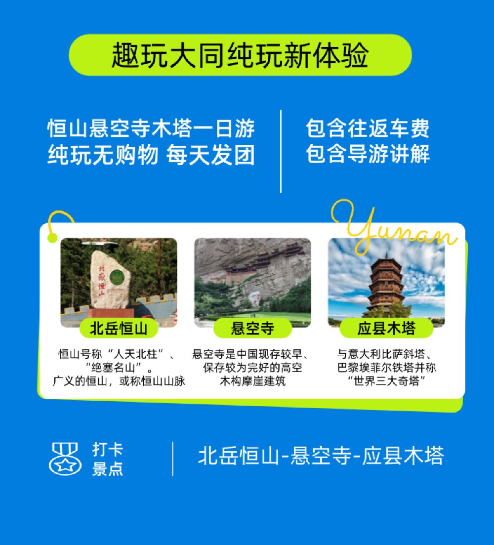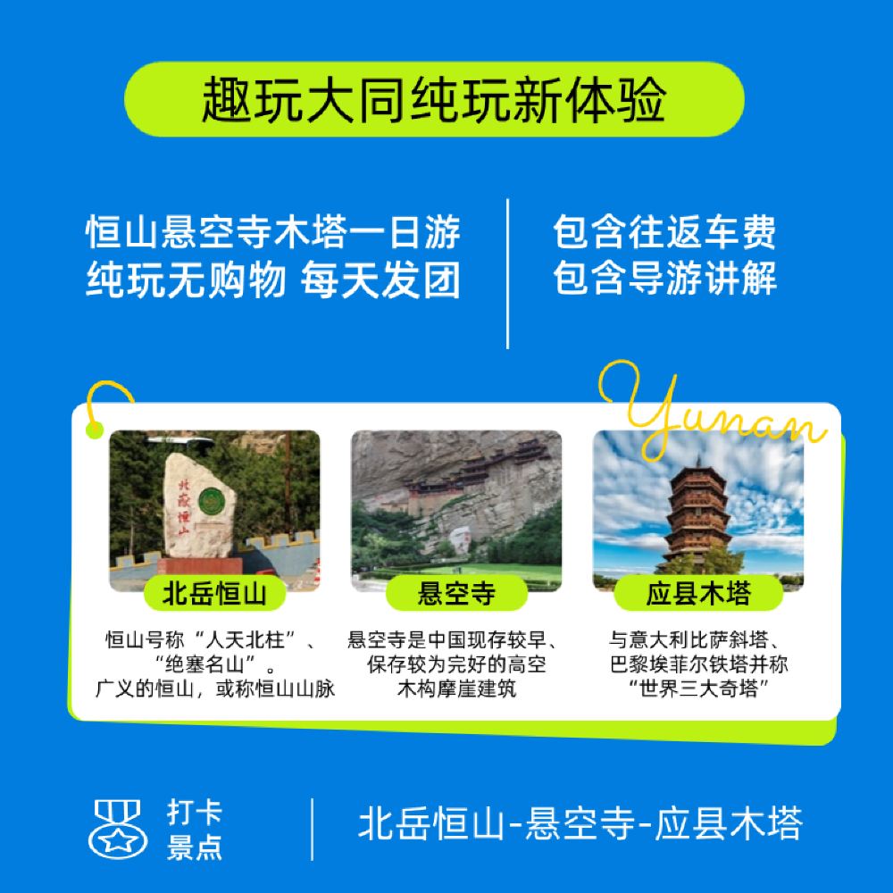 恒山+悬空寺登临+应县木塔一日游【纯玩无购物&导游讲解】【【细节服务真诚】天天发团,一车一导【身份登记】出行带好身份证。】