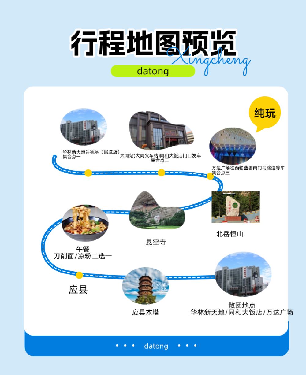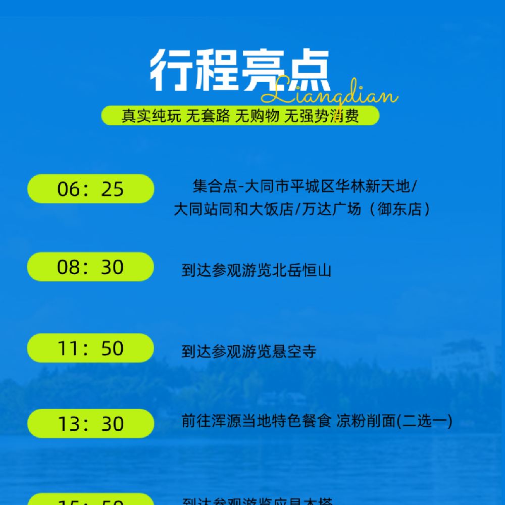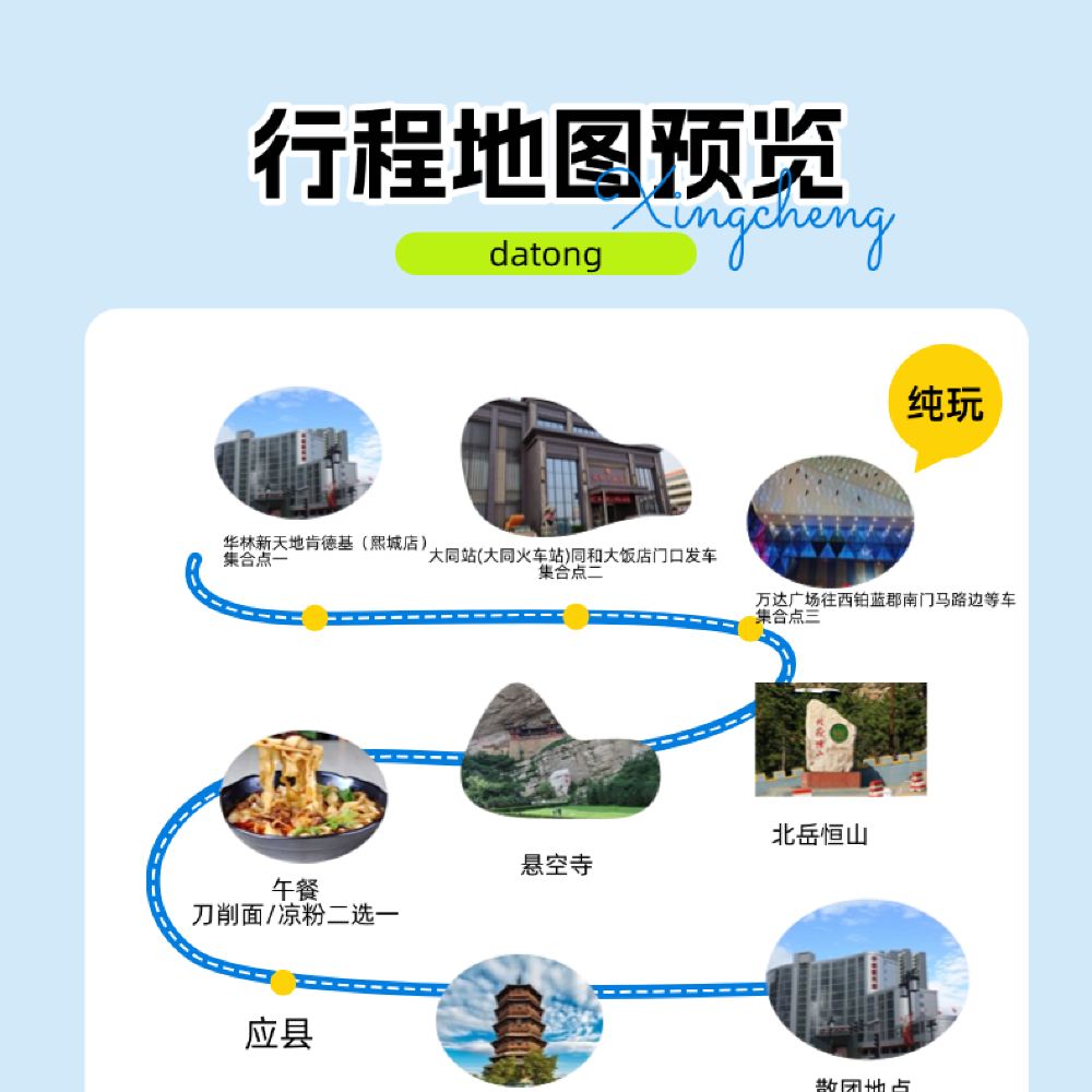 1.此程人少时候会有应县木塔悬空寺云冈石窟线路前半段合车游览,午餐后小车切入游览木塔景点,5人以下木塔景点无导游,敬请谅解。