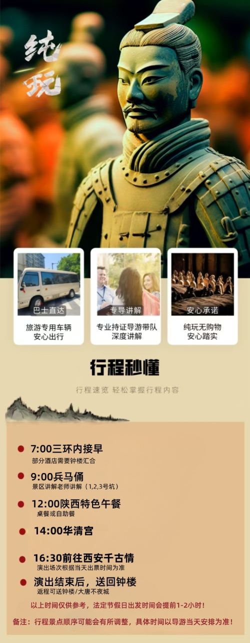 陕西秦始皇帝陵(兵马俑)+华清宫+千古情一日游【16人团】【成人套餐包含[兵马俑门票+华清宫门票+千古情门票+车费+餐费+导服+无线耳麦]】