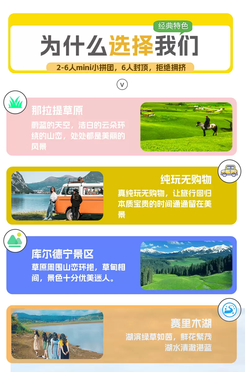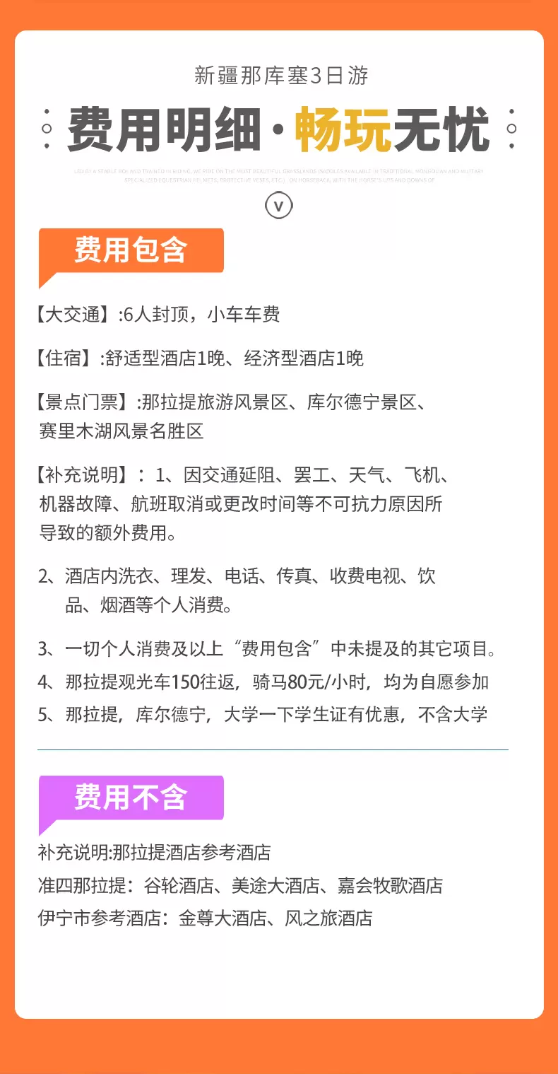 优惠证件退费标准:由于旅行社团购协议价原因,不以景区门票外卖价退费,进景区前出示优惠证件!行程结束前工作人员退费!此团退费政策如下:那拉提景区(全免退60元/人,半价退30元/人),库尔德宁景区(全免退40元/人,半价退20元/人),赛里木湖景区 (全免退50元,半价不退费)