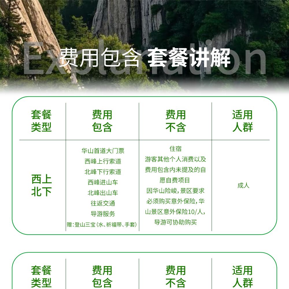 5.出游当天因天气原因等不可抗力因素造成景区临时关闭或索道停运等特殊情况,导致游客无法上山,只收取西安至景区的往返车费,其他未产生的费用可以退。【车费标准以各个套餐对应的婴儿车费为准,下单视为同意!