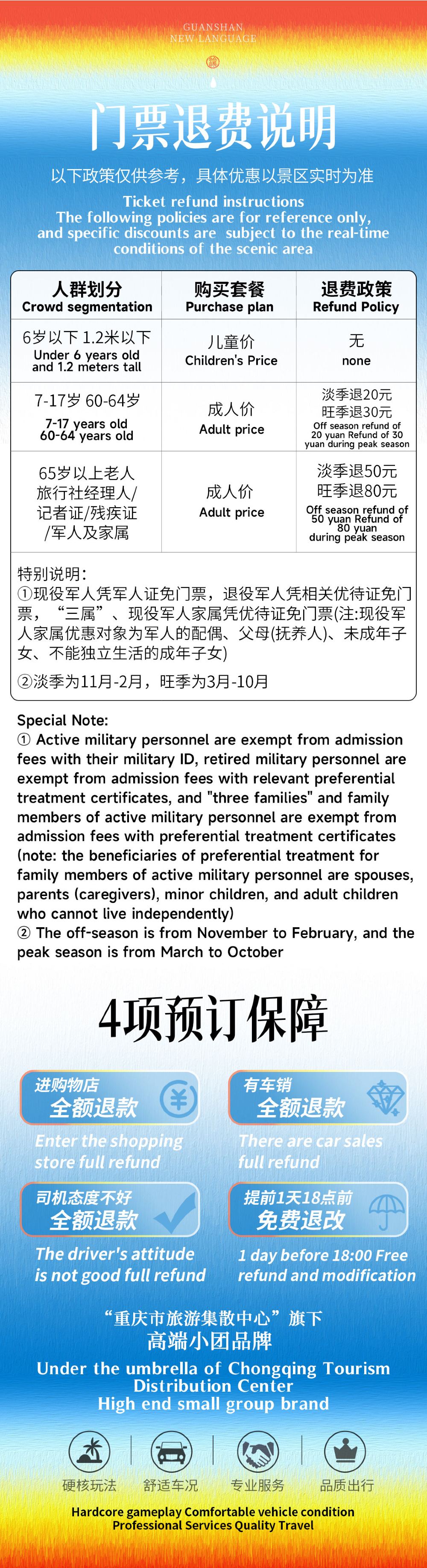 2、行程中有较大可能出现堵车、排队等不可预计因素,返程时间可能会延迟,凡当天有返程大交通(飞机、火车等)不建议您参加此行程!