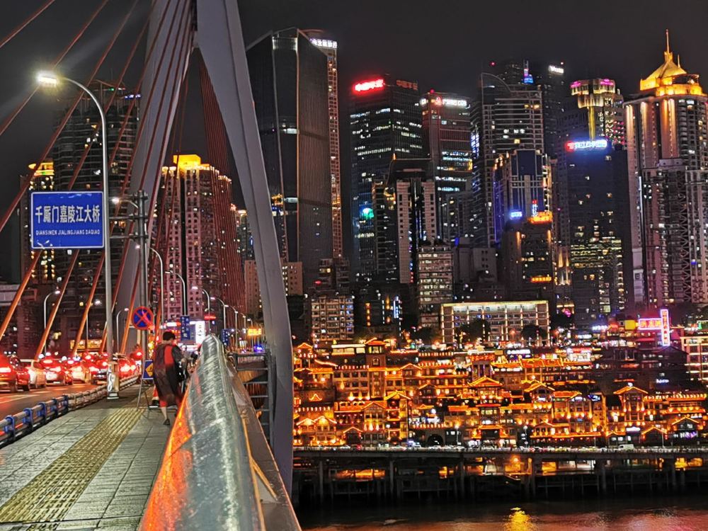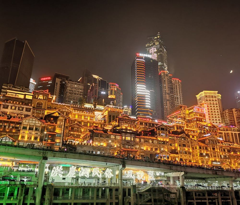 ▲ 洪崖洞民俗风貌区是逛山城老街、观赏两江风光、品尝当地美食的好去处。洪崖洞民俗风貌区位于渝中区沧白路,长江、嘉陵江两江交汇的滨江地带,以具有巴渝传统建筑特色的“吊脚楼”为主体,依山就势,沿江而建。