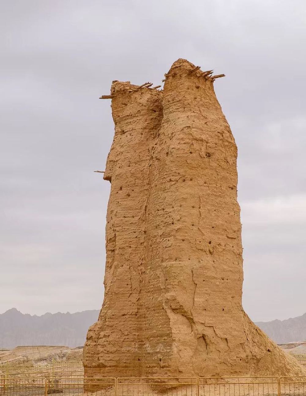 ▲ 克孜尔尕哈烽燧,位于中国新疆维吾尔自治区阿克苏地区库车市依西哈拉镇,建于汉代,为古代军事建筑。 克孜尔尕哈烽燧坐落于却勒塔格山南麓盐水沟沟口的冲击台地上,海拔1200米,现存残高13.5米8 ,东西长约6.5米、南北宽4.5米5 。克孜尔尕哈烽燧是古丝绸之路北道上时代早期,保存完好的烽燧遗址 ,且位居丝绸之路北道的黄金地段,区位条件优越,具有较高文化与旅游价值