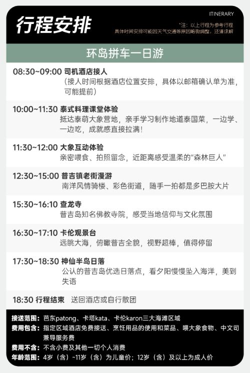 普吉岛环岛拼车+泰萌大象营泰餐烹饪一日游查龙寺普吉镇神仙半岛【[小团纯玩]至多12人,中文司机陪同,行程轻松不赶】