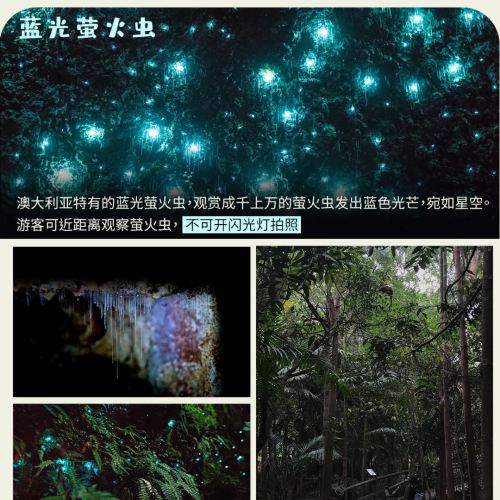 19:00由导游带领进入热带雨林,途中讲解雨林中各类有趣的夜间动植物,发现并了解南半球独有的蓝光虫