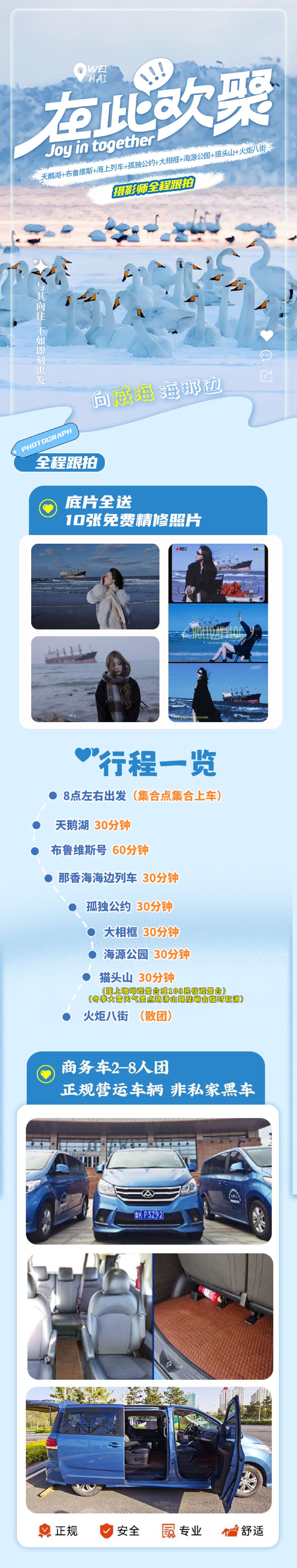 【小团上门接送】八大景点可选全程跟拍孤独公约+布鲁维斯【[度假优选]精游浪漫威海,留下威海日落。赠送天鹅粮+拍照道具】