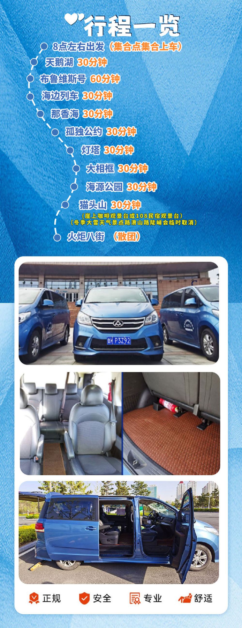 注意:五一、十一、暑假、寒假等节假日期间出行人数较多,具体出发时间会有所提前,具体集合出发时间以前一天导游晚上电话通知为准。