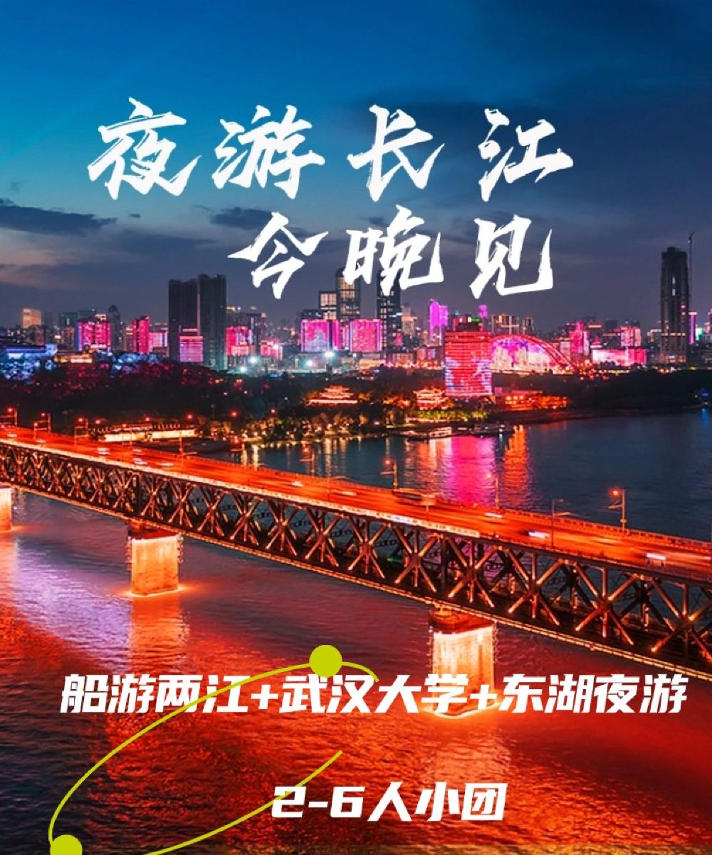 武汉两江游览·夜游长江+武汉大学+东湖夜游【2-6人小团】【【服务保障】24小时贴心管家+车载移动电源+矿泉水】