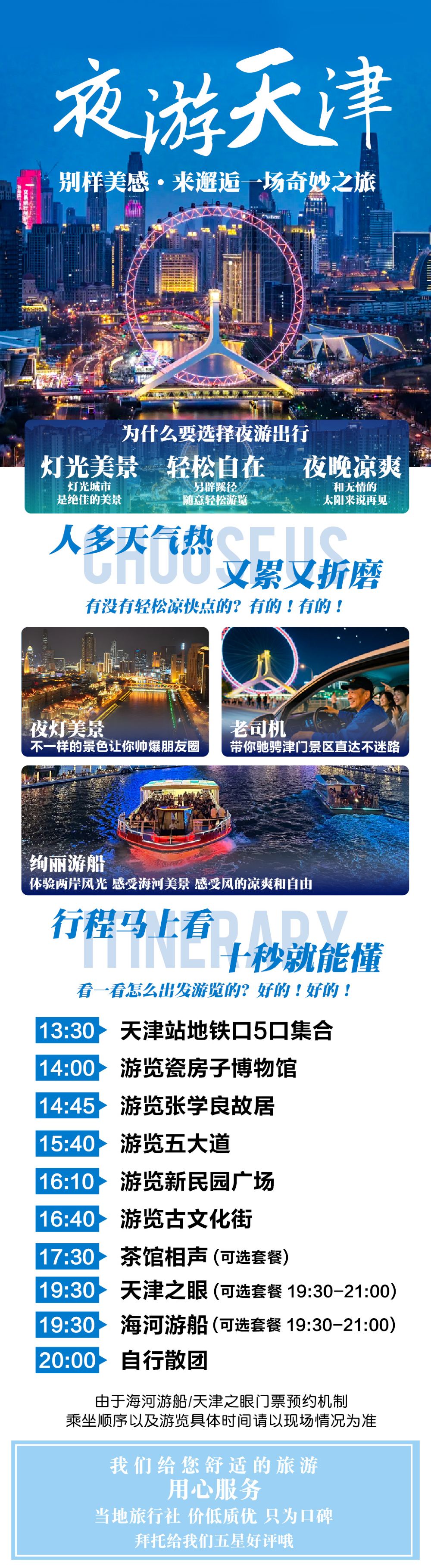 1、五一、国庆、春节法定节假日及寒暑假旺季期间,因景区客流较大,排队现象严重加之交通管制容易出现拥堵,为了能够有个更好的出游体验,导游会根据当天情况调整集合时间和地点,景点参观顺序,具体请以实际通知为准,敬请谅解!