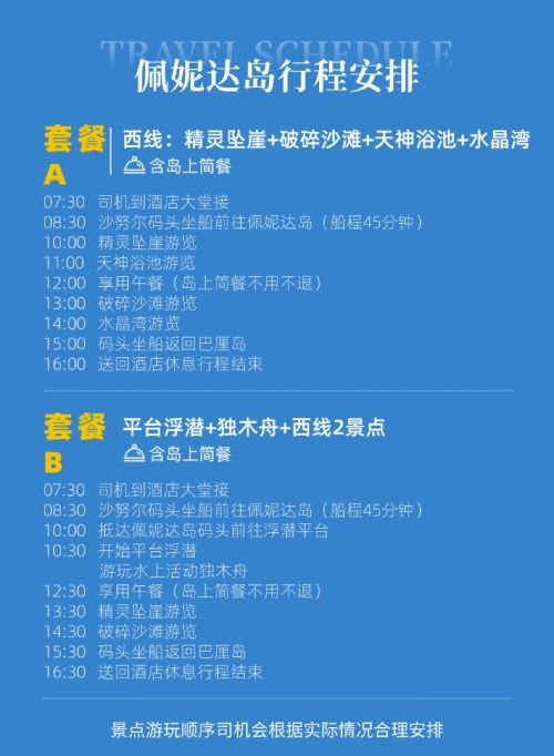 套餐A:佩尼达岛西线出海一日游:午餐:岛上自助餐-西线:精灵坠崖+破碎沙滩+天神浴池+水晶湾
