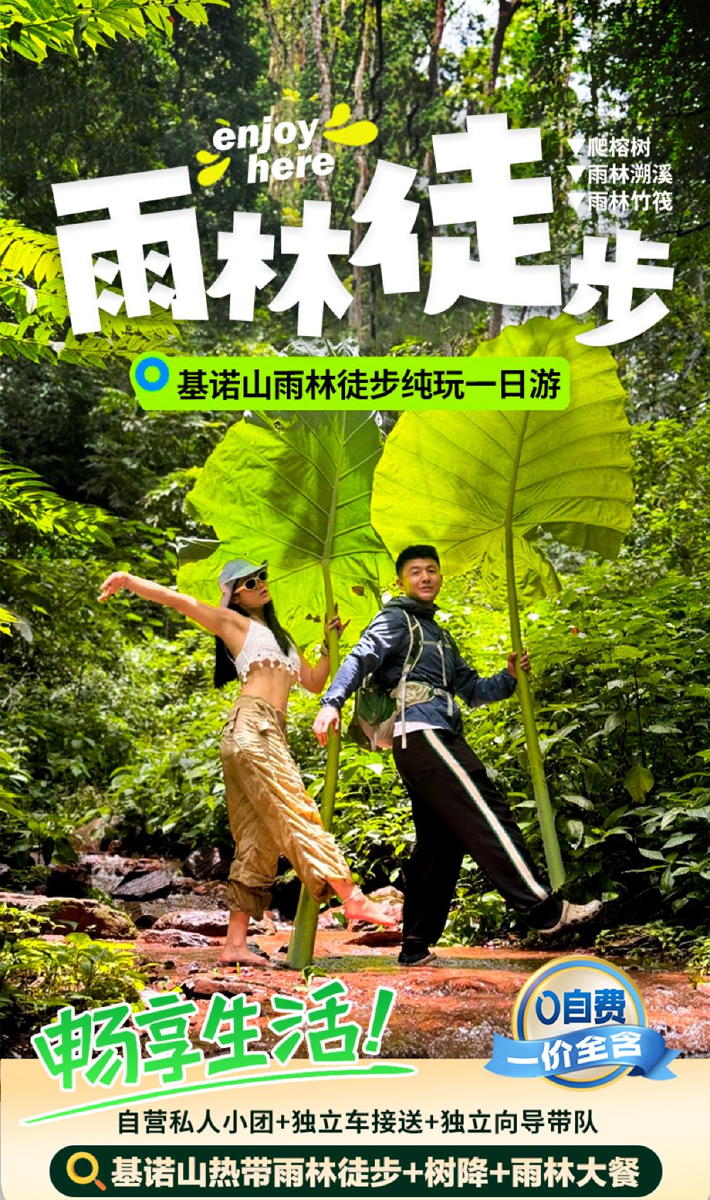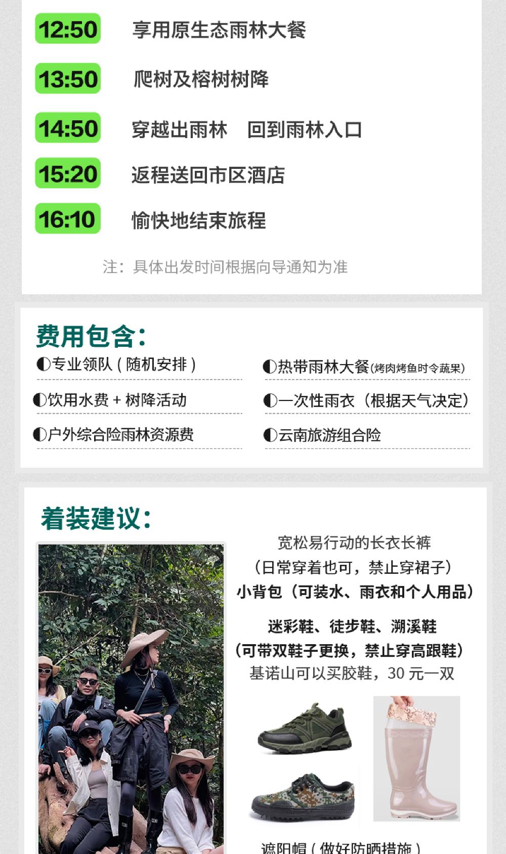 基诺山雨林徒步体验项目标准化服务,没有单项目收费,因此因天气,季节,项目维修等因素,有些项目没法参加不做单项退费,请知晓!!