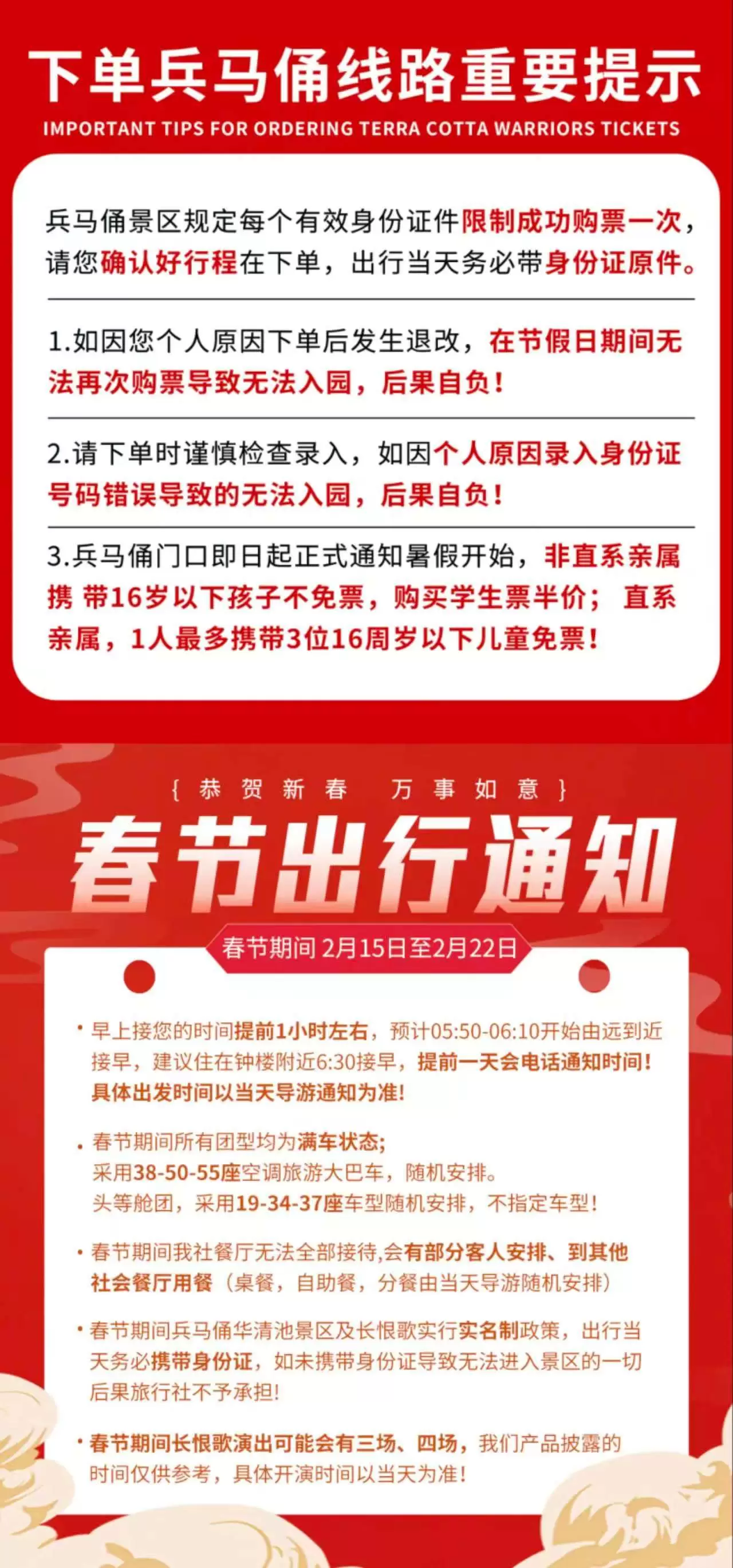 重要提示:请勿重复下单,兵马俑门票每个身份只能成功订票一次,若因个人原因重复定门票,导致现场到兵马俑景区无法入园,我社不承担责任,请知晓!