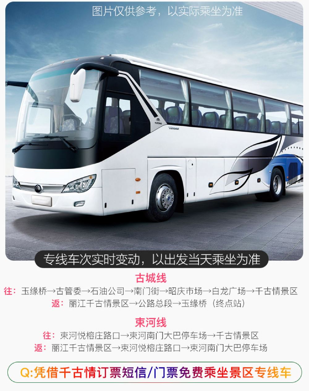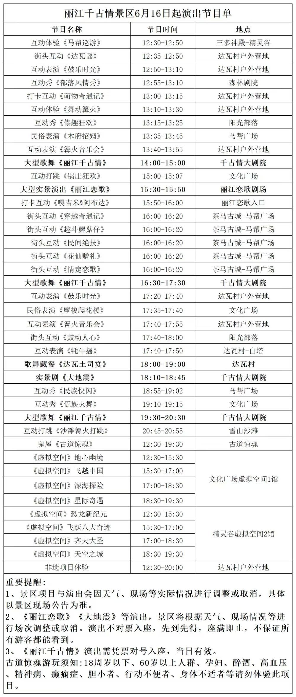 3、淡季 丽江恋歌时间15:30 大地震18点;如因特殊情况,景区可能取消 丽江恋歌和大地震表演,无费用可退,由此带来的不便敬请谅解~
