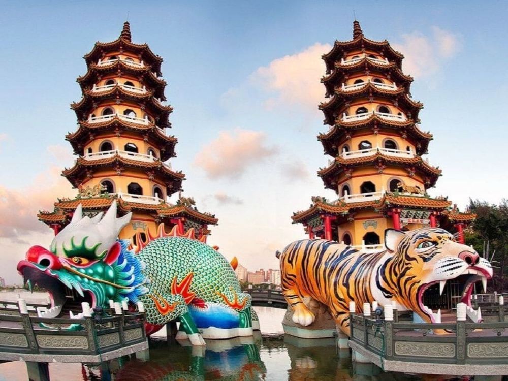 ▲ 龙虎塔巍然矗立莲池潭畔,红黄相间的塔身在碧水蓝天下格外醒目。