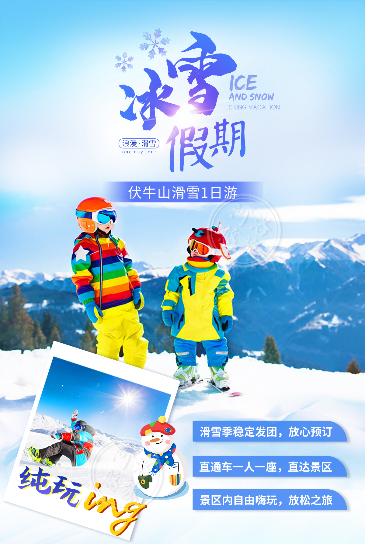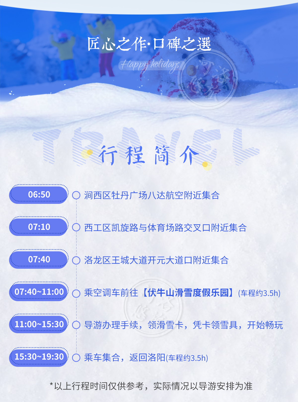凡报名跟团出游,每个出行人均含出游当天旅游人身意外险+雪场险,双险为您保驾护航!(购买时请务必填写准确的出行人姓名身份证号!如因信息原因导致投保失败后果自理)