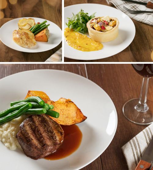 1)多汁烧烤牛排配田园蔬菜和卡卡杜梅子酱