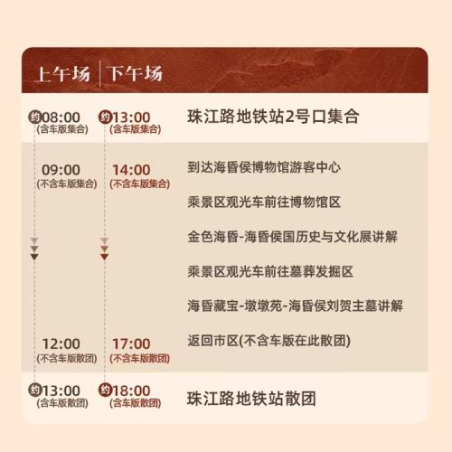 【特别注意】 含车版上午约08.00,含车版下午约13:00,实际是在珠江路地铁站2号口附近集合(携程无法选择地铁站作为集合点,只能选择江西省博),如需不含交通版请下单不含接送套餐。