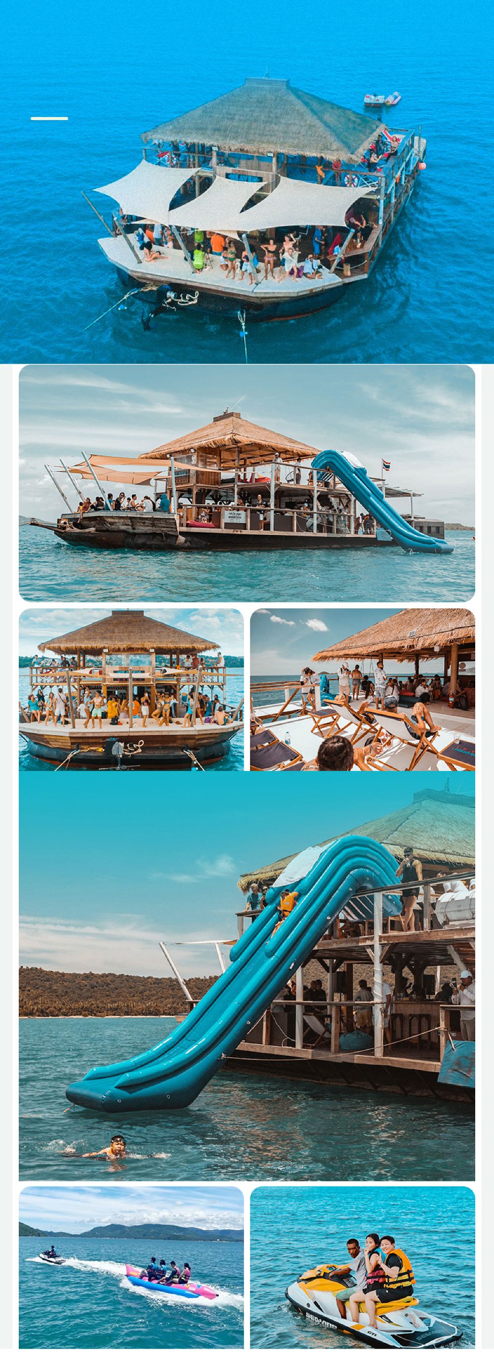 玩乐:浆板、海上滑梯、皮划艇、水上泳池、香蕉船、船上提供足底按摩(轮流每人15分钟)、浮潜用具、不限量鸡尾酒