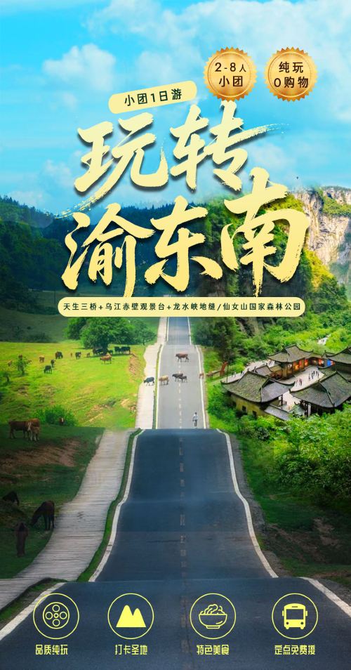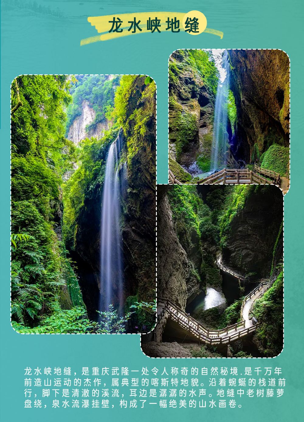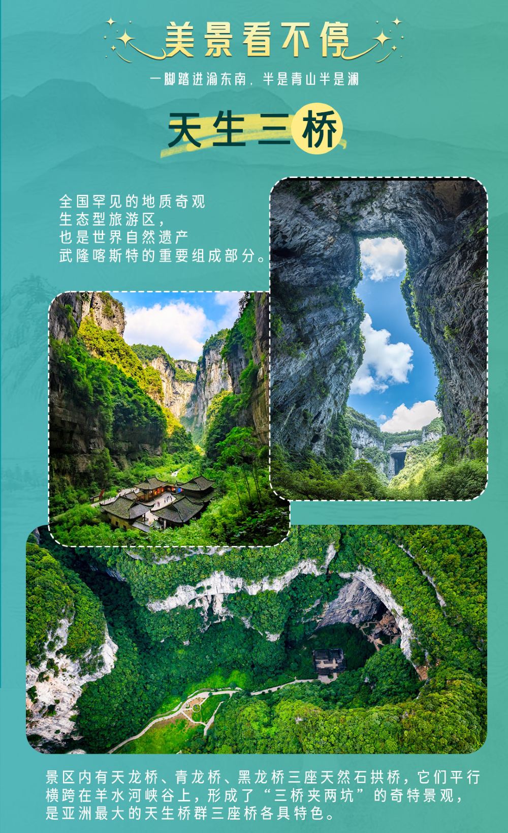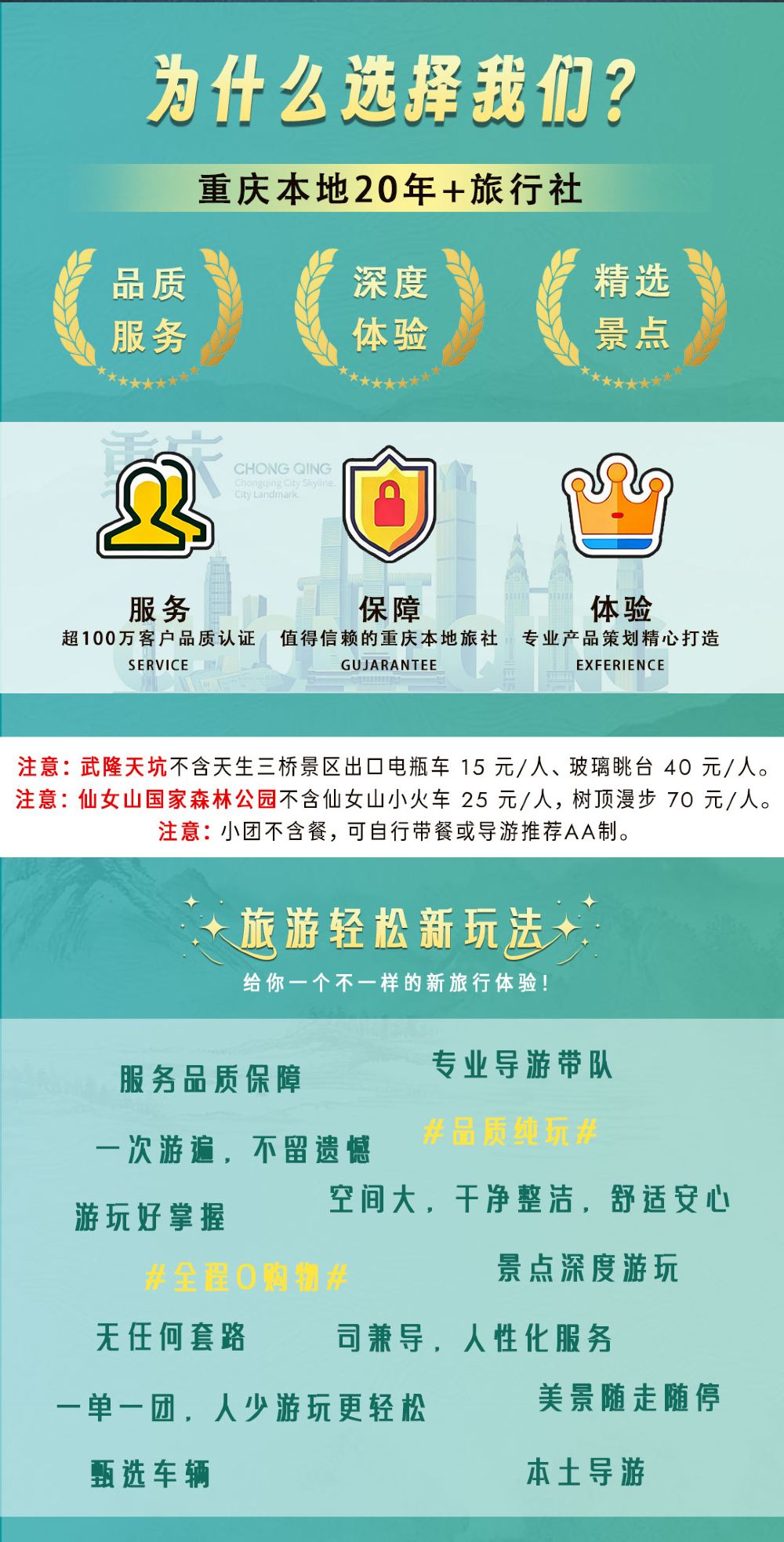 ③不含天生三桥景区出口电瓶车 15 元/人,仙女山小火车 25 元/人,玻璃眺台 40 元/人,树顶 漫步 70 元/人。若需要请自行购买。