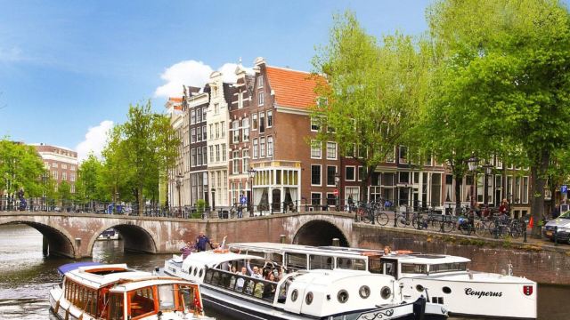 ▲ 游船泊在运河上,两岸红砖房蹭着绿枝,石桥驮着行人 —— 这就是荷兰风情的鲜活模样。