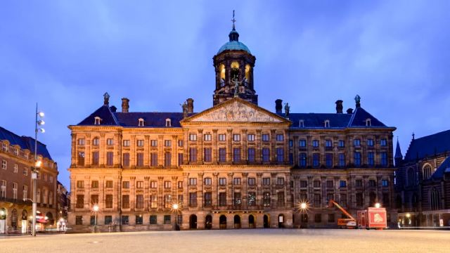 ▲ 暖金色建筑立在暮色里,雕饰裹着复古质感,藏着伦勃朗《夜巡》这类经典作品。