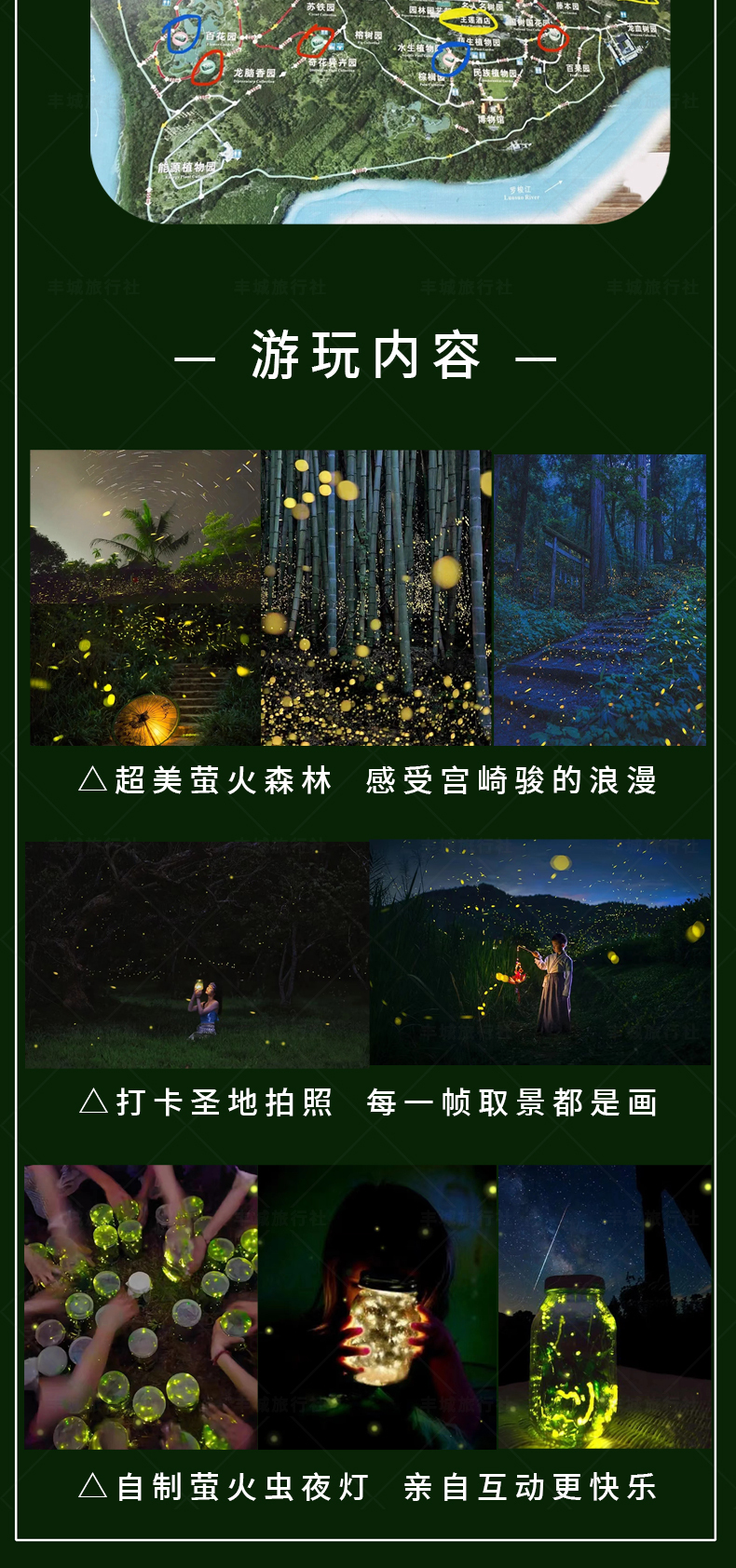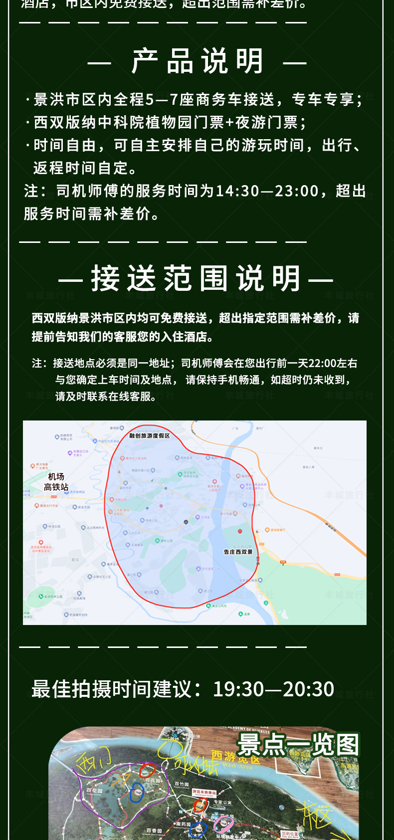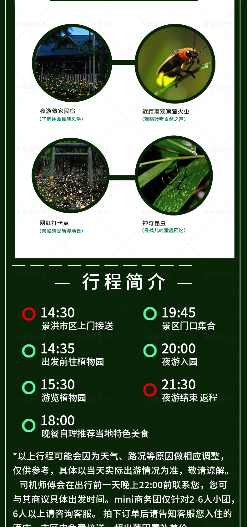 【拼车拼日游拼夜游】:包含往返车(拼车)+植物园门票+夜游拼团导服讲解(不含电瓶车,不含白天导游讲解)遇旅游淡季,人数不超过6人时,根据实际人数安排车辆,并提供酒店上门接送服务;超过6人,需自行前往集合点(13:50泼水广场民生银行附近&14:00告庄西双景北门)集合上车;