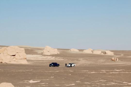 ▲ 乘越野车破沙而行,驶入雅丹地貌秘境。在 “金狮迎宾” 观景台凝望风蚀土墩化作昂首金狮,驻足 “狮身人面像” 前惊叹自然神力,攀登 “双塔峰” 仰观光影斑驳的雅丹柱。